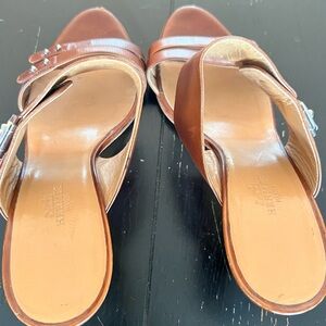 Elegant Hermes sandals in tan leather. Features sleek straps with metallic accents.