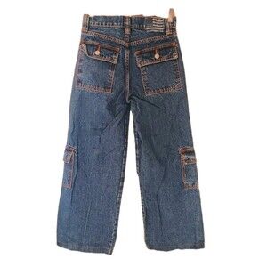 Authentic Revice Denim "The Baja Cargo" jeans in a classic dark indigo wash. Features a high-rise waist, baggy wide-leg silhouette, and iconic American flag embroidery on the back pocket. These are 100% cotton, non-stretch premium denim. 6-pocket cargo design with a button fly. Handcrafted in Los Angeles. Excellent pre-owned condition. Length 39in, waist 28in, rise 11in, inseam 28in.