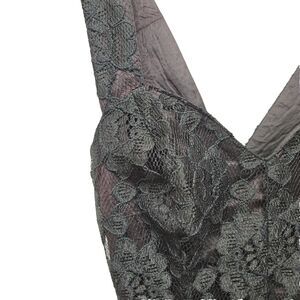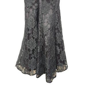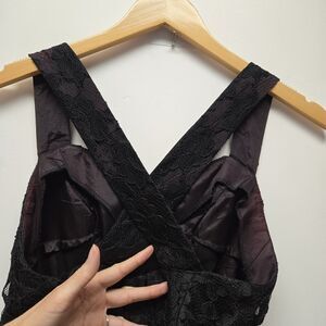 Features beautiful black lace overlay on top of burgundy/mauve satin-feel lining. Vintage 90s/Y2K piece. A-line fit-n-flare style. Cross-back. Zipper on back.