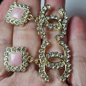 Elegant Chanel earrings featuring pink and gold tones with sparkling dangle CC logo charms.