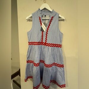 Kuraki Blue & White Stripe Dress w/ Red Ric Rac Trim | Sleeveless | Size S | NWT