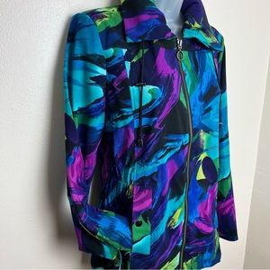 Gorgeous multi colored print jacket. Artsy with splashes of color. 2 front pockets. Long front zipper. Cinched waist. Sleeves can be worn straight or cuffed. Excellent condition. Size Small pit to pit 19”, length 24”. This can be worn casual or dressed up with black slacks.