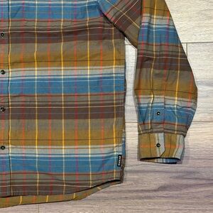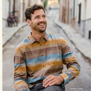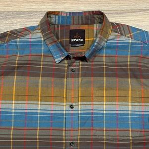 Prana Wyndwell Flannel Shirt in Driftwood Blue/Brown/Red/Yellow Plaid. Size XL. Excellent preowned condition, gently worn. Pit to pit measures 25.5” and Length 31”. 60% organic cotton, 40% polyester.