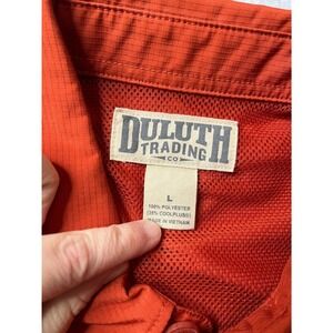 Conquer your day with this versatile Duluth Trading Co. button-up shirt, crafted for comfort and performance. Engineered with a textured fabric that feels as good as it looks, this vibrant orange shirt boasts two chest pockets for convenient storage, perfect for keeping essentials close at hand. The breathable mesh back panel ensures you stay cool and dry, even during strenuous activities. Ideal for outdoor adventures, casual workdays, or simply enjoying a relaxed weekend.