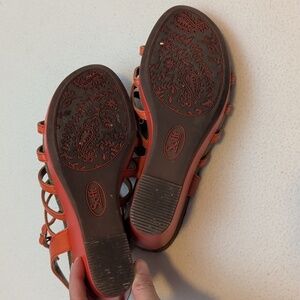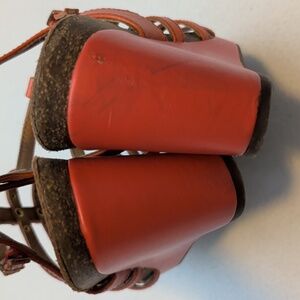Step out in style with Sofft's chic coral red color wedge sandals. Perfect for some flirty fun, these sandals provide both comfort and elegance. with a bold color and shiny gold accents. Wedge heel is 3.5-inch high with a lot of life left in the rubber soles. Slight scuff on the back of the right heel - please view photos closely. Otherwise shoes are in excellent condition.