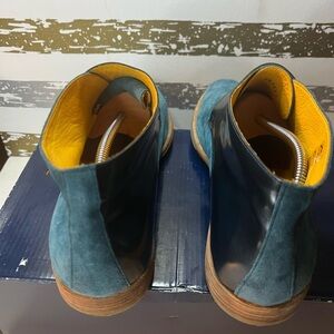 These Wholecut '48 Monk Strap Boots are expertly handcrafted with lagoon blue suede and cobalt patent leather, finished with sand leather soles.