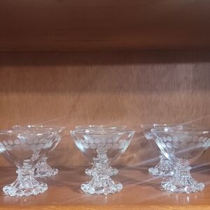 Set of clear glass dessert bowls with intricate designs. Perfect for serving desserts or as decorative pieces. Great condition no chips or damage anywhere. (W-7)