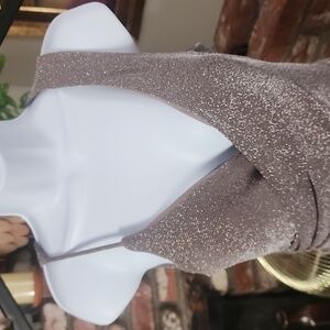 Elegant Betsy & Adam metallic cocktail dress in a shimmering purple tone. Features a flattering sleeveless silhouette with delicate straps, a draped wrap-style bodice, and a sleek fitted midi length. Perfect for weddings, formal events, parties, or evening occasions.