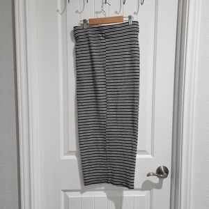Ribbed navy blue and white midi skirt. worn maybe once at most. This is a fitted skirt with no slits. Depending on your height this could be more like an ankle length skirt. The material is not super thick but also not super thin.