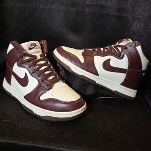 Step up your style with these Nike high-top sneakers in maroon and off white. Perfect for casual outings or sporty adventures.