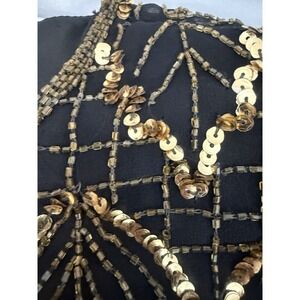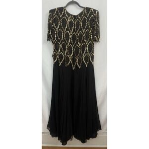VTG Laurence Kazar 100% Silk Black Gold Beaded Gown Womens Size XL. Fully Lined, Back Zip, Shoulder Pads. Lining is 100% Polyester. In good condition. No stains