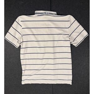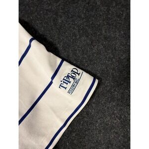 Elevate your golf game with this classic Ralph Lauren Polo Golf performance polo shirt. The crisp beige fabric, adorned with timeless navy stripes, offers a sophisticated look on and off the course. Embroidered with the iconic Polo player logo on the chest and the "Tip Top Poultry Inc." logo on the sleeve, this shirt adds a touch of personalized style. Designed for comfort and breathability, it's perfect for a day on the fairway or a casual outing. *see small stain in photo 5