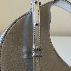This LOFT Metallic Crescent Crossbody Bag adds a sleek, modern touch to any outfit. The crescent silhouette and silvertone finish make it perfect for day or evening wear, while the removable and adjustable strap allows versatile styling. Its roomy interior and magnetic closure combine practicality with effortless sophistication.