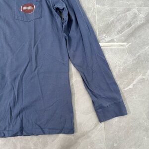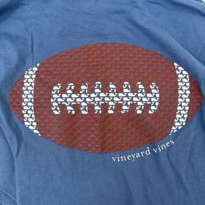Good condition - Men’s Vineyard Vines Football Whales Pullover Hooded Long Sleeve Shirt. Small spot of staining on near right cuff (as pictured). Colors: blue, brown, and white. Size: L.