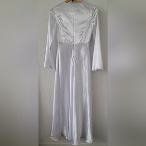 Stunning Aw Bridal white crystal satin Genevra dress with long flared sleeves and empire waist. Ideal for formal occasions.