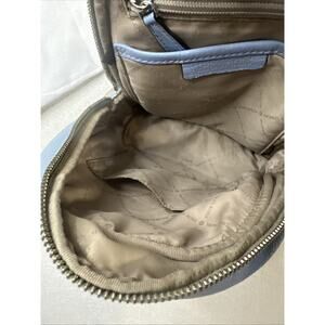 The Michael Kors Erin Small Convertible Backpack in Sky Blue Studded Leather is a stylish and versatile handbag designed for women. This backpack features a solid light sky blue exterior made of leather with studded accents, giving it a modern and edgy look. It has a zip closure and double blue leather handles, making it easy to carry. The convertible design allows it to be worn as a backpack or a crossbody, making it a practical and fashionable choice for everyday use. The original dust bag cover is included.