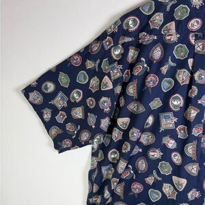 A standout Bayou short sleeve button-down featuring an all-over golf club crest and badge print in rich navy with multicolor detailing. This shirt delivers strong retro country club energy with a playful, elevated twist — perfect for the current golfcore, quiet luxury parody, and Y2K novelty trend cycles.