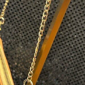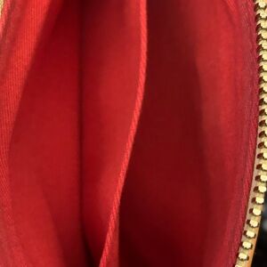 Chic wristlet with a striking chevron design. Features a secure zip closure and detachable strap. Comes with unbranded gold-tone chain. Red cloth interior w/ 1 slip pocket. Never used.