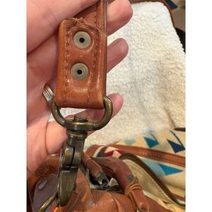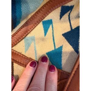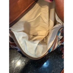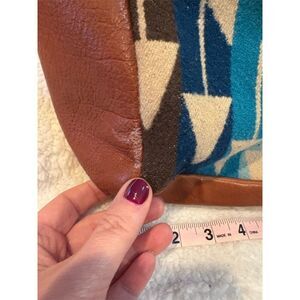 This Arc Of A Diver shoulder bag for women features a multicolor geometric pattern, crafted from wool and leather. It embodies a vintage cowgirl chic theme, perfect for casual occasions. The bag is spacious with a zippered pocket and a secure zipper closure. It is pre-owned with some flaws but still has plenty of life left.