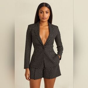 Featuring a tailored, fully lined XS blazer with matching size 2 high-waisted shorts, both adorned with crisp white polka dots. The shorts have an elastic waist band on the back for extra stretch and comfort. This set blends playful charm with polished sophistication.