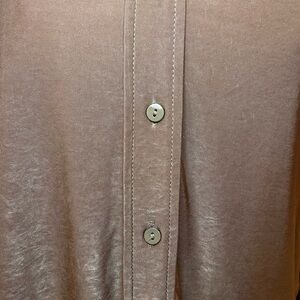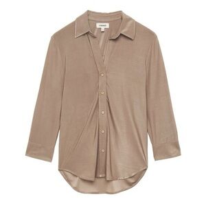 Keywords: L’AGENCE top, silky blouse, taupe shirt, neutral top, button down, workwear blouse, quiet luxury, minimalist style, capsule wardrobe essentials, luxe basics, women’s small, soft sheen top, long sleeve blouse