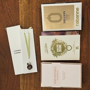 - 3 perfume samples: irresistible by Givenchy, Gaultier Divine by Jean Paul Gaultier, and million gold by rabanne
