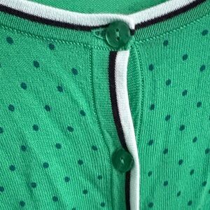 Kelly green cardigan with cute dotted pattern. Button-up style with light blue and black contrast trim. Like new, never worn other than to try on. No pilling.