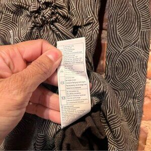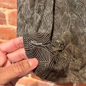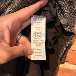 Skunkfunk tunic top with open shoulders and knot details - asymmetrical one pocket and in excellent preowned condition! Fabric printed with brand throughout - bamboo/cotton blend.