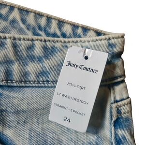 Keywords: Juicy Couture jeans, light wash jeans, destroyed jeans, distressed jeans, straight leg jeans, chain detail jeans, womens jeans, casual jeans, vintage jeans, denim, Y2K fashion, trendy jeans, designer jeans, stylish jeans