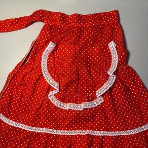 Vintage 1950s Red Polka Dot Half Apron Opaque Ruffles White Lace Pocket Retro
