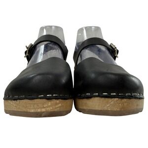 Lottas Stockholm Wood Clog Size 39 / 9 Sandals Buckle Ankle Strap Black Leather