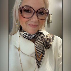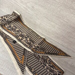 Elevate your style with this elegant neck scarf featuring a classic paisley and houndstooth design. The rich black, brown, and cream trim colors make it a versatile and neautral accessory for any outfit. Brand new, no tag.
