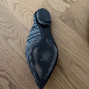 Elegant mules with a textured black and white tweed design. Perfect for adding sophistication to any outfit.