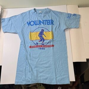 Celebrate the spirit of the Honolulu Marathon with this Volunteer shirt from 1986. Featuring a vibrant blue color and a classic design, it's perfect for marathon or running enthusiasts. Vintage form 1986, single stich as shown in photos. The cut and look indicate a women's small to me. Tag indicates small.