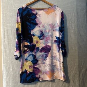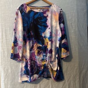 Lightweight three-quarter sleeve pullover blouse with a gathered front side bottom hem. Floral with blue, purple, black, gold and white. Polyester, spandex. Machine washable. Sz L. PTP 22”, length 28. Excellent condition.