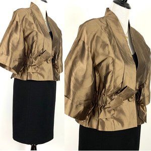 Luxurious, classy & cosmo appealing antique gold jaqcquard silk kimono jacket. Low V-neckline. One button closure at the waist. Extedded shoulders, 3/4 length wide sleeves with cuffs. Wide elastic at the waist finished with two gorgeous bows. Fully lined. 100% Silk. Excellent quality & condition.