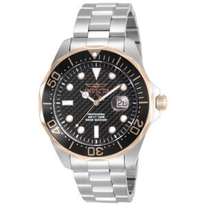 This incredible Invicta watch from the Pro Diver collection offers a Quartz movement, and a sophisticated rose gold, steel case. The face displays a black carbon fiber dial protected by our proprietary Mineral Crystal. The design is completed by a silver stainless steel band. This timepiece can resist water for up to 200m.Plunge into any horizon using the steadfast guidance of the Invicta Pro Diver. Stylishly classic, internal workings are forged with variations of bold movements. Built with confident prowess, the fortitude with which these timepieces function makes the Pro Diver the quintessential in performance.