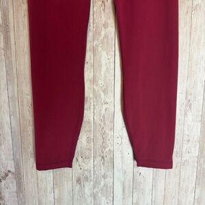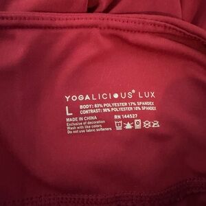 Size large Yogalicious Lux high-rise crop leggings in burgundy red. Soft, stretchy performance fabric with wide elastic waistband and smooth, supportive fit. Cropped length.