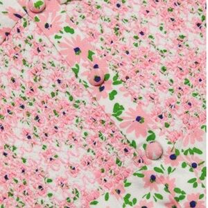 This button-front dress features a lovely floral print and smocking to define the waistline.