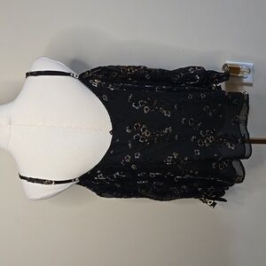 Love Sam black floral velvet camisole top featuring dimensional velvet florals and a romantic cold-shoulder silhouette with subtle whimsigoth energy. This piece blends soft gothic romance with bohemian femininity, making it ideal for layering under blazers, styling with denim, or pairing with skirts for an elevated night-out look. The sheer black base with velvet floral detailing gives it texture and depth while keeping the overall feel effortless and wearable.
