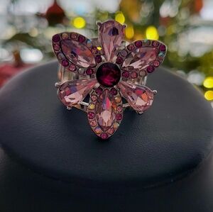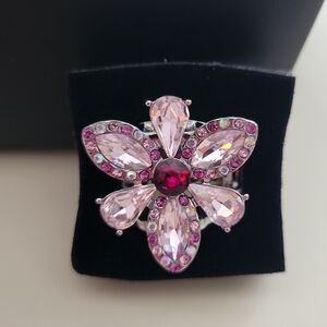 Add a touch of elegance with this stunning pink and silver floral stretch ring. Fits size 6-11. Perfect for any occasion.