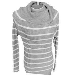 Hooked Up by IOT, Cowl Neck Sweater, Striped Sweater, Gray & White Sweater, Long Sleeve Sweater