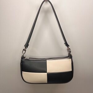 Checkerboard shoulder bag in black and white. This small purse features a contemporary checkerboard pattern on the front and a solid black back. Its compact size and shoulder strap make it a convenient accessory. The bag has a main zippered compartment for secure storage.
