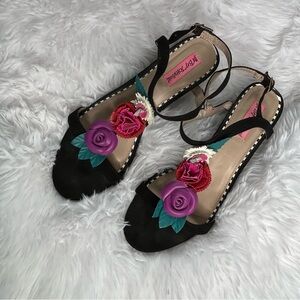 Betsey Johnson Adde Black Sandals Floral Accents and Black/White Heels Size 8.