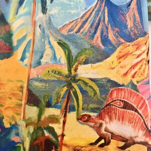 • Multicolor tropical print with palm trees, volcanoes, plants, and dinosaurs