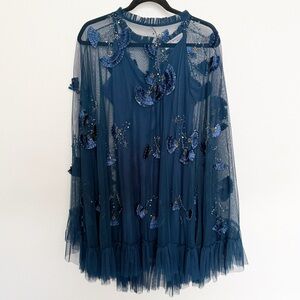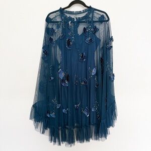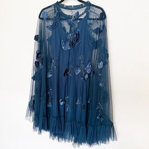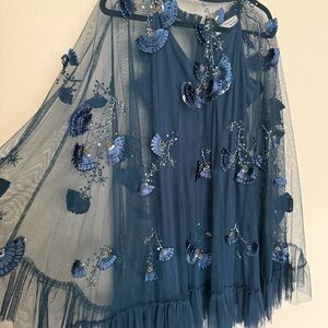 Absolutely stunning blue dress with delicate embroidery. Color is called Twilight blue. Almost like a blue/green. Features sheer overlay and ruffle accents. Comes with underneath slip.