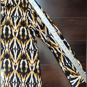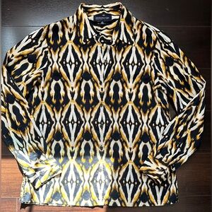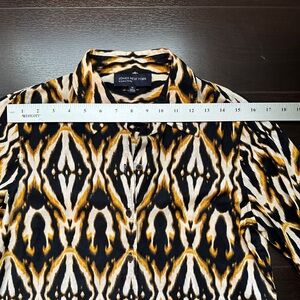 Bold and stylish Jones New York button-up shirt featuring an eye-catching geometric/ikat-inspired print in black, cream, and gold tones. Made from 100% breathable cotton for all-day comfort. Classic collar, long sleeves with button cuffs, and a relaxed yet polished fit—perfect for work, creative office settings, or elevating a casual look.
