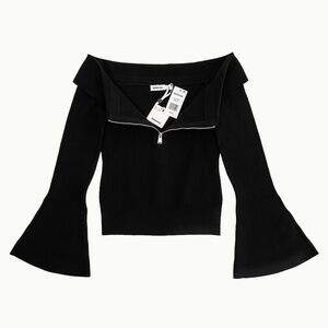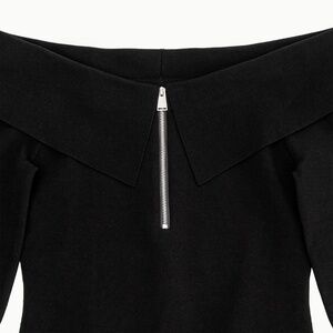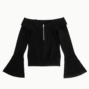 The Rebecka Top in Black. This long sleeve off-shoulder piece features a flared sleeve and a sleek zip detail at the front. The fitted silhouette highlights the neckline, creating a bold and sophisticated look.