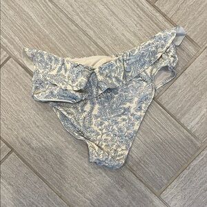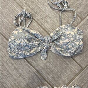 Chic bikini with a blue leaf design. Features a stylish tie-front top. Size small. Gently used. Very cute ruffles on bottoms.