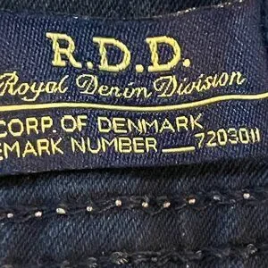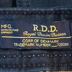 Tagged with the Manufactured Garment citing R.D.D. (Royal Denim Division - Corp of Denmark - inside back waist.